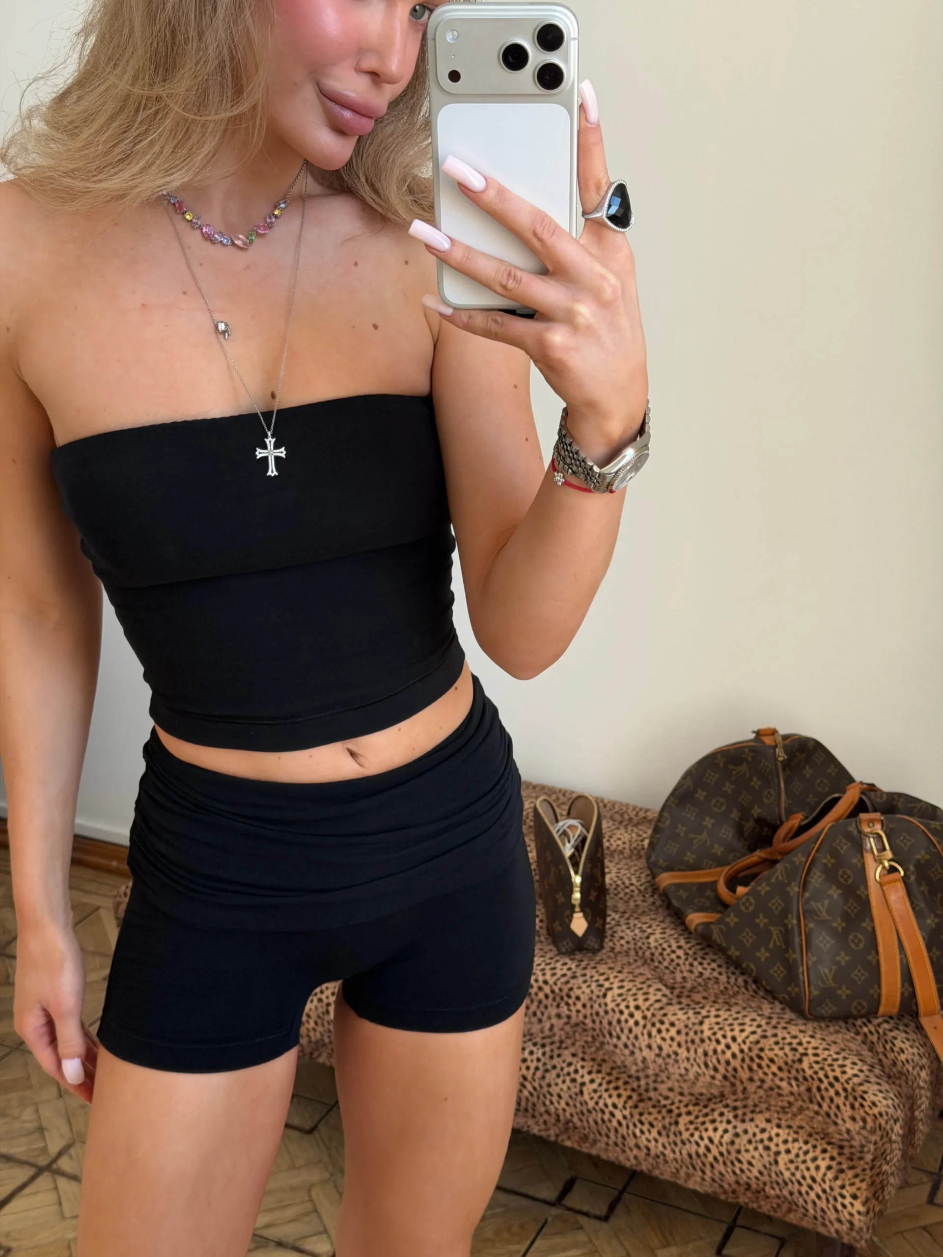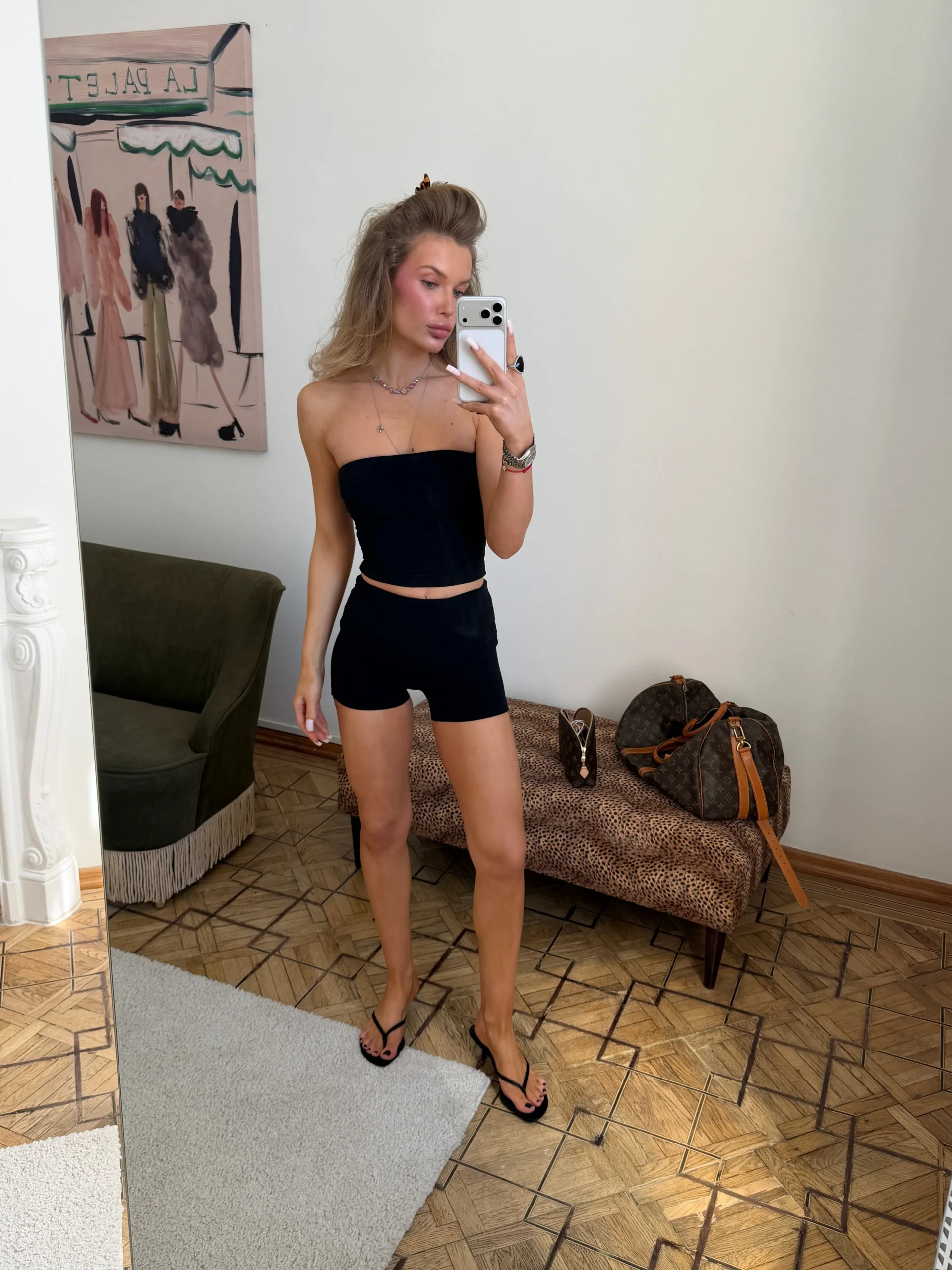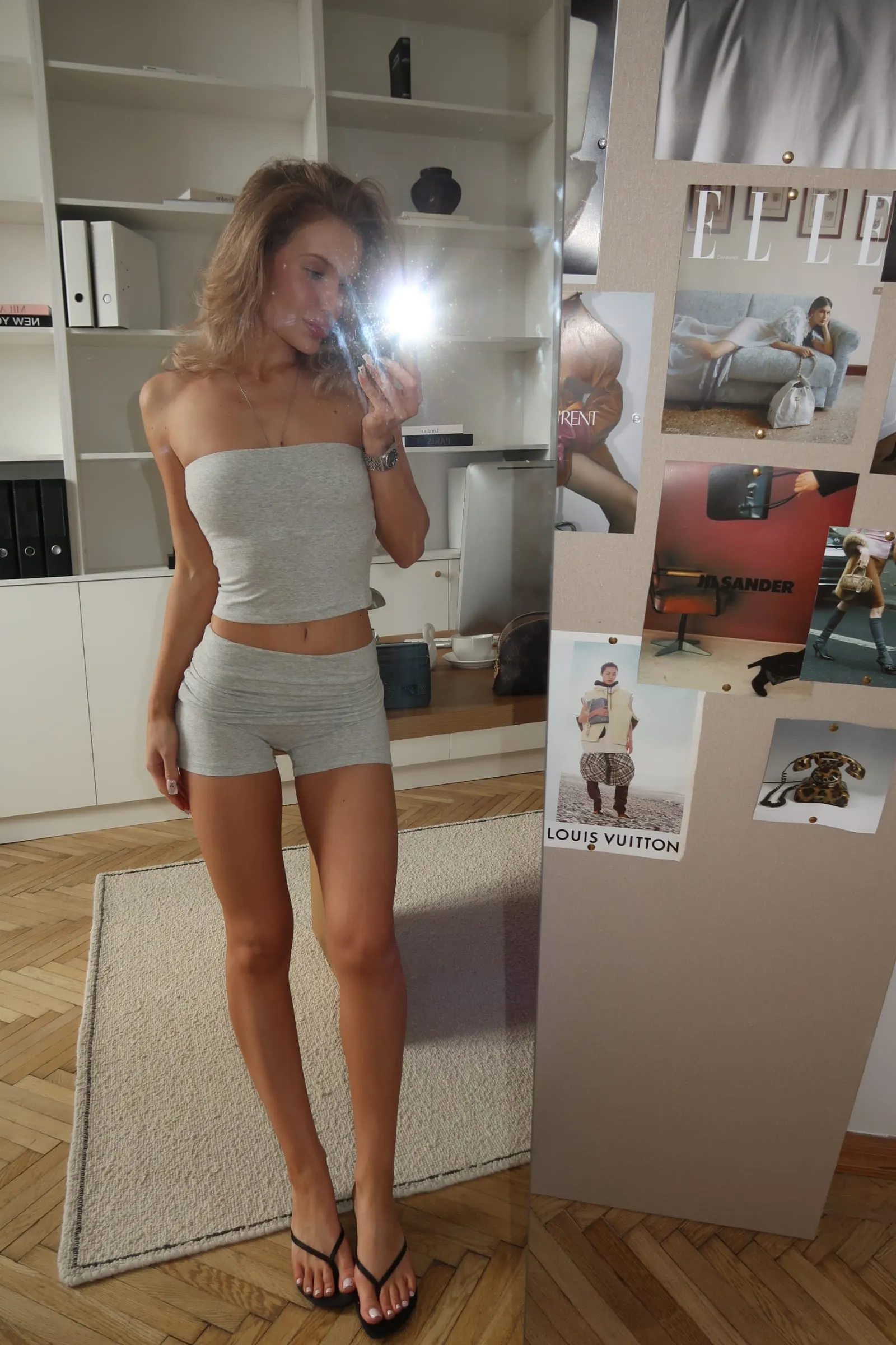 Бавовняний комплект у мінімалістичному стилі. Топ зі знімними чашечками добре тримається та делікатно формує силует. Шорти з широким поясом підкреслюють талію й забезпечують комфортну посадку. Ідеальний для щоденного комфорту та стильних casual-образів
