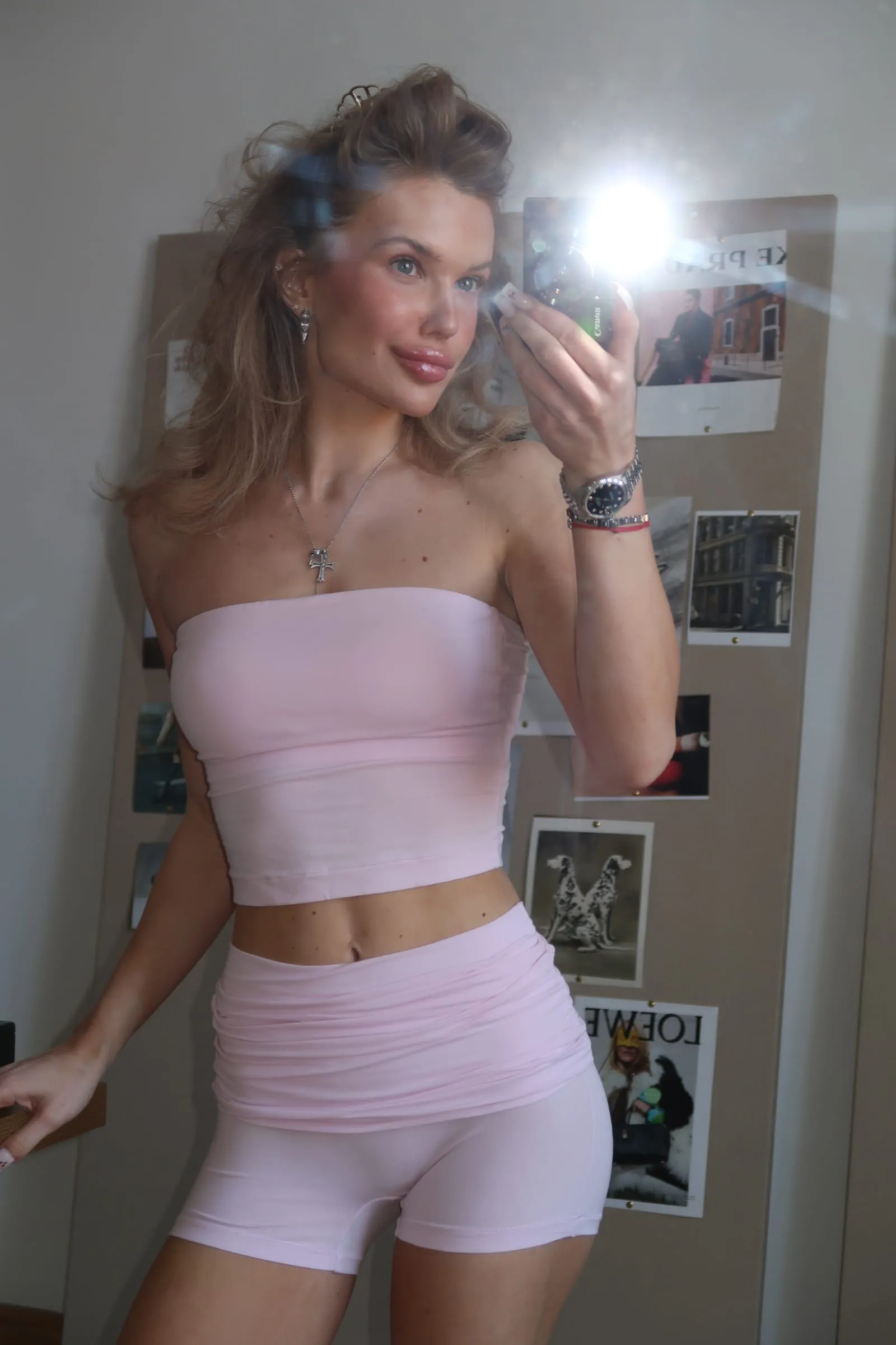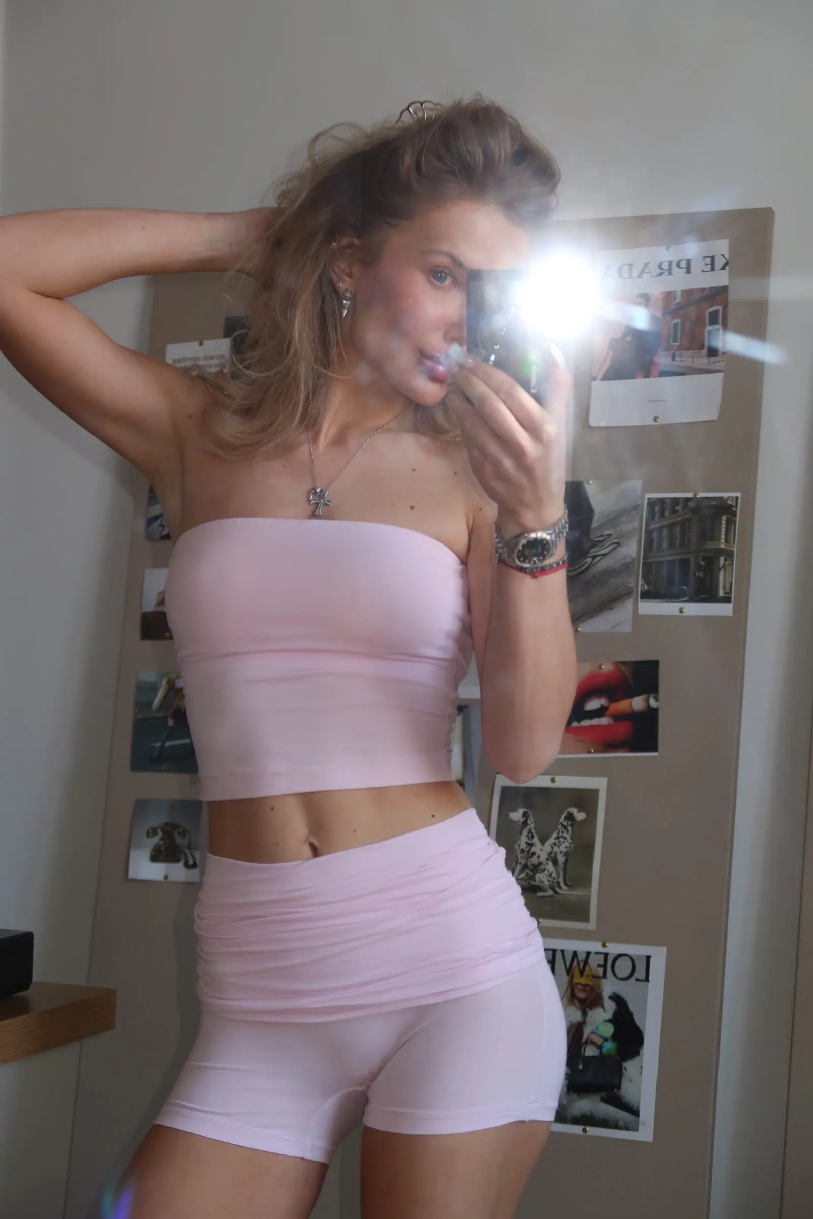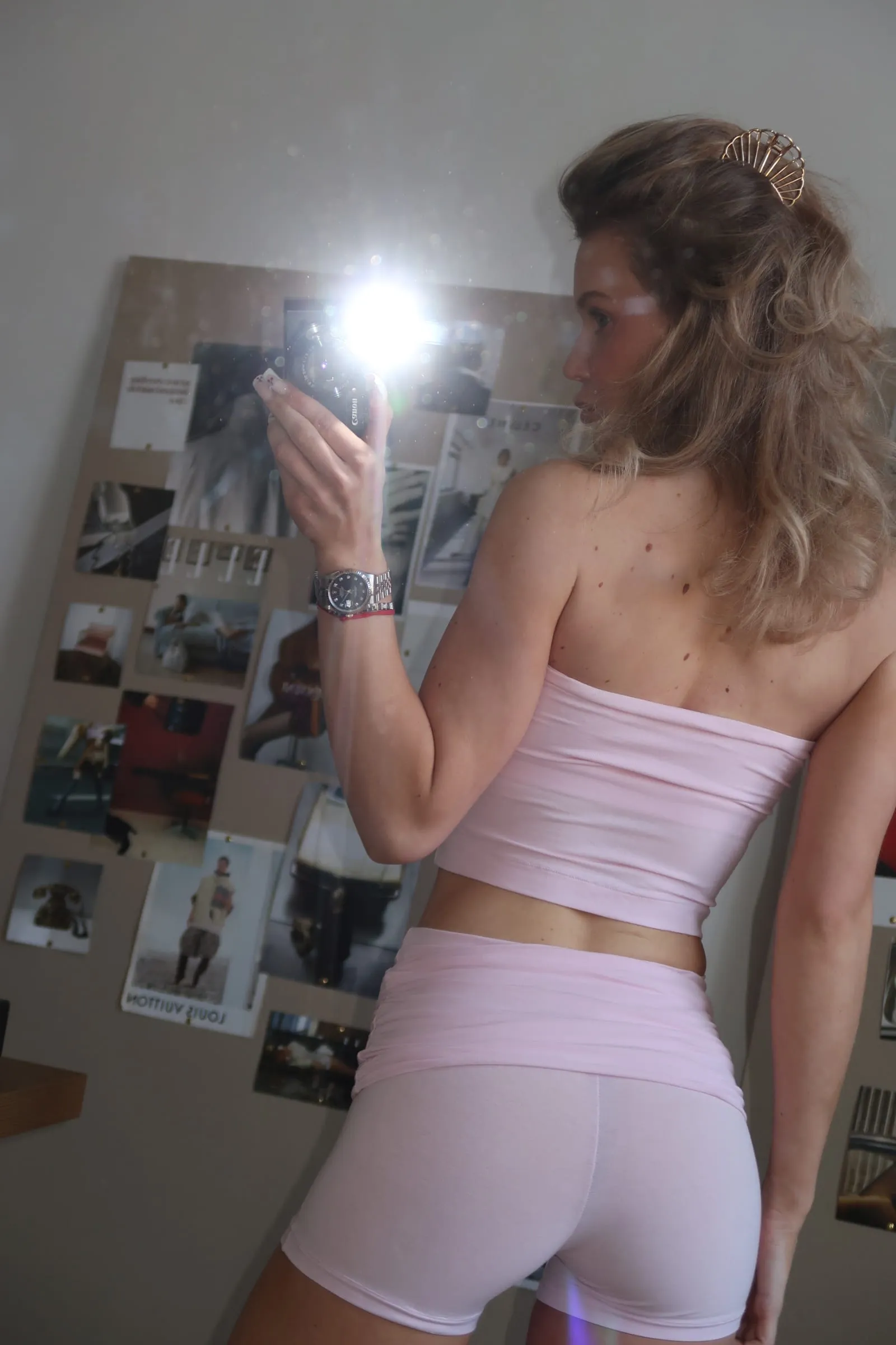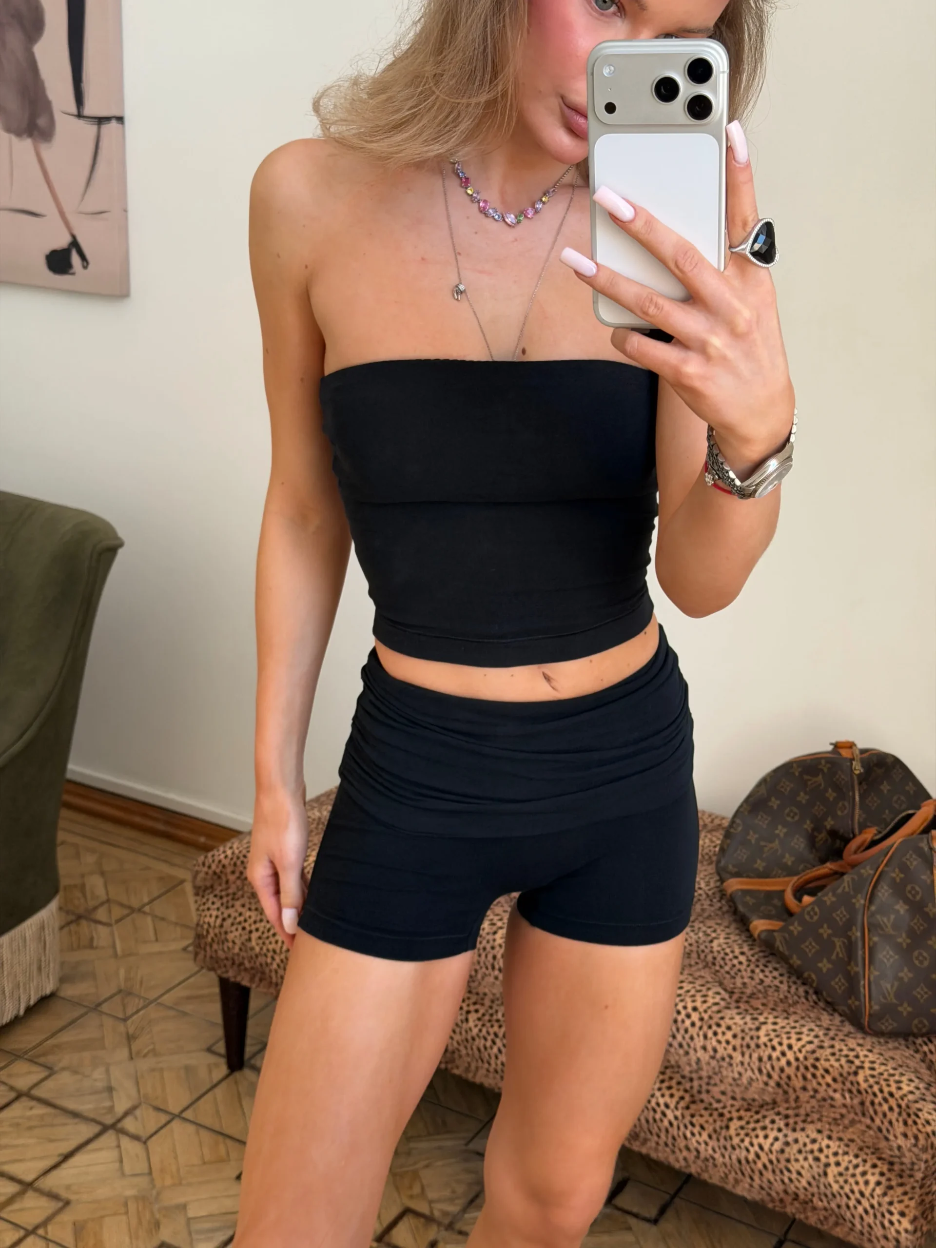 Бавовняний комплект у мінімалістичному стилі. Топ зі знімними чашечками добре тримається та делікатно формує силует. Шорти з широким поясом підкреслюють талію й забезпечують комфортну посадку. Ідеальний для щоденного комфорту та стильних casual-образів